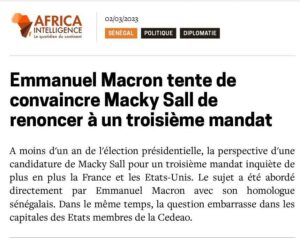 Selon le journal Africa Intelligence dans son édition du 02 Mars 2023, Emmanuel Macron tente de convaincre Macky Sall de renoncer à un troisième mandat